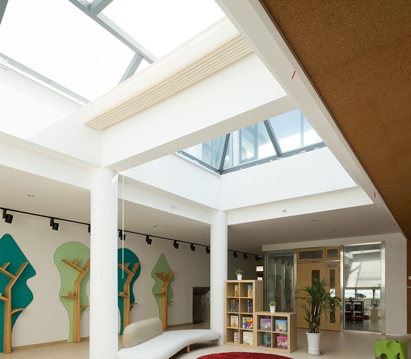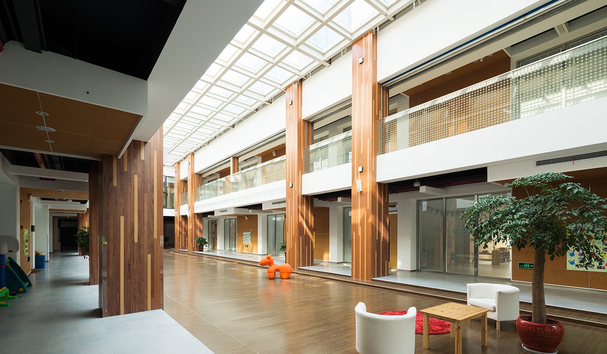 Unlike the typical Chinese kindergarten, NEWTON ZHANGJIAGANG seeks for a more open and homey atmosphere. With this vision, we decided to create a central atrium space which functions as an internal playground as well as a living space for children. Surrounding this large atrium space, all the class rooms were laid out and are visually connected. A circulation corridor was provided for children in order to see and to be seen by each other. This interconnected atrium is the main characteristic of NEWTON ZHANGJIAGANG, which brings a lot of memorable scenes for the children. The atrium space also functions as public zone for various events and ceremonies, creating more memories for both parents and children. NEWTON ZHANGJIAGANG is the very first kindergarten in Suzhou area, which seeks for a unique space for its own educational purpose.